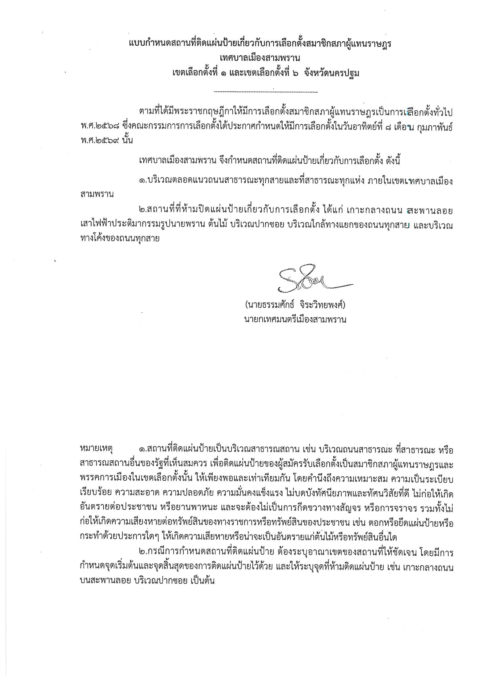 ประกาศเทศบาลเมืองสามพราน เรื่อง กำหนดสถานที่ หลักเกณฑ์และวิธีการปิดประกาศเกี่ยวกับการเลือกตั้งสมาชิกสภาผู้แทนราษฎร พ.ศ.๒๕๖๙
