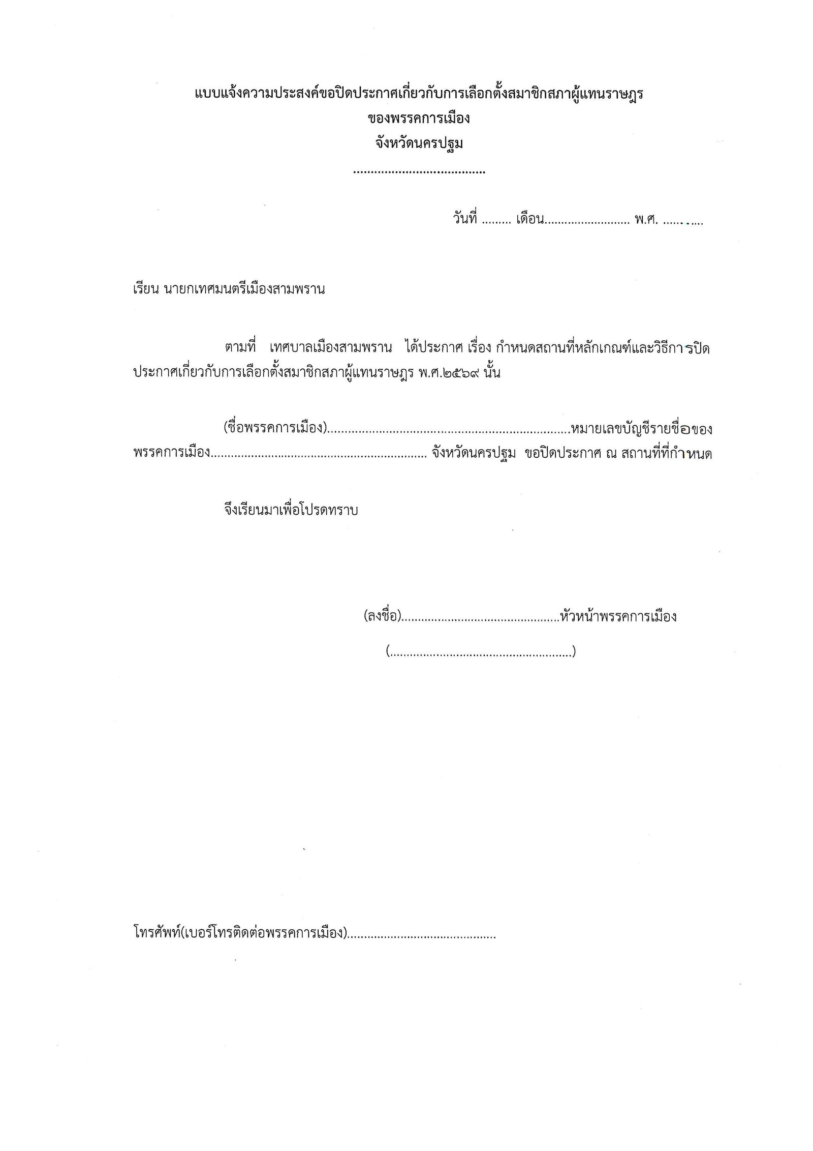 1.แบบกำหนดสถานที่ติดแผ่นป้ายเกี่ยวกับการเลือกตั้งสมาชิกสภาผู้แทนราษฎร เทศบาลเมืองสามพราน เขตเลือกตั้งที่ ๑ และเขตเลือกตั้งที่ ๖ จังหวัดนครปฐม (เอกสารแนบ 2) 2.แบบแจ้งความประสงค์ขอปิดประกาศเกี่ยวกับการเลือกตั้งสมาชิกสภาผู้แทนราษฎรของพรรการเมือง จังหวัดนครปฐม (เอกสารแนบ 3)